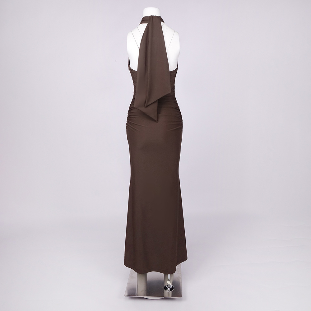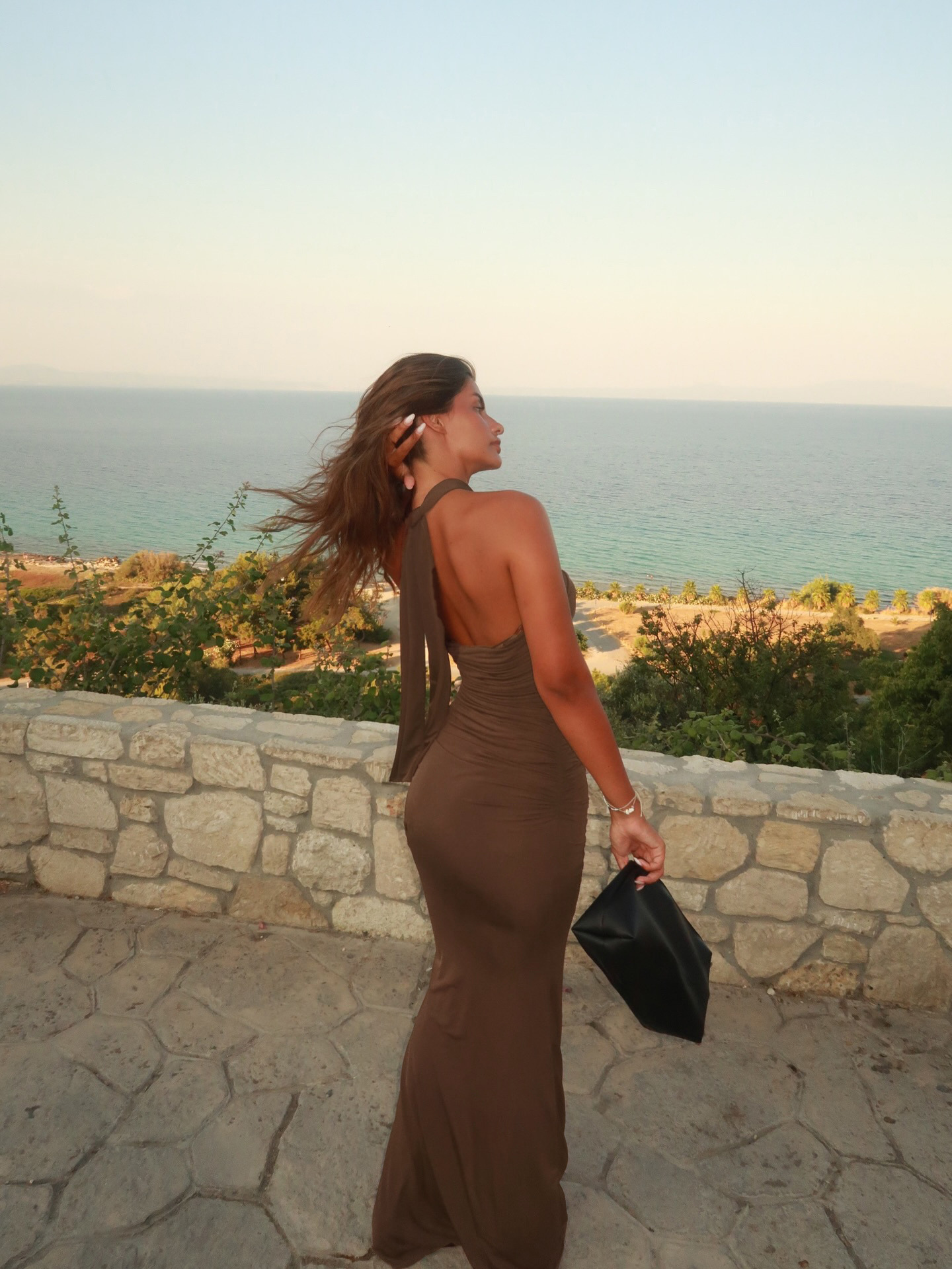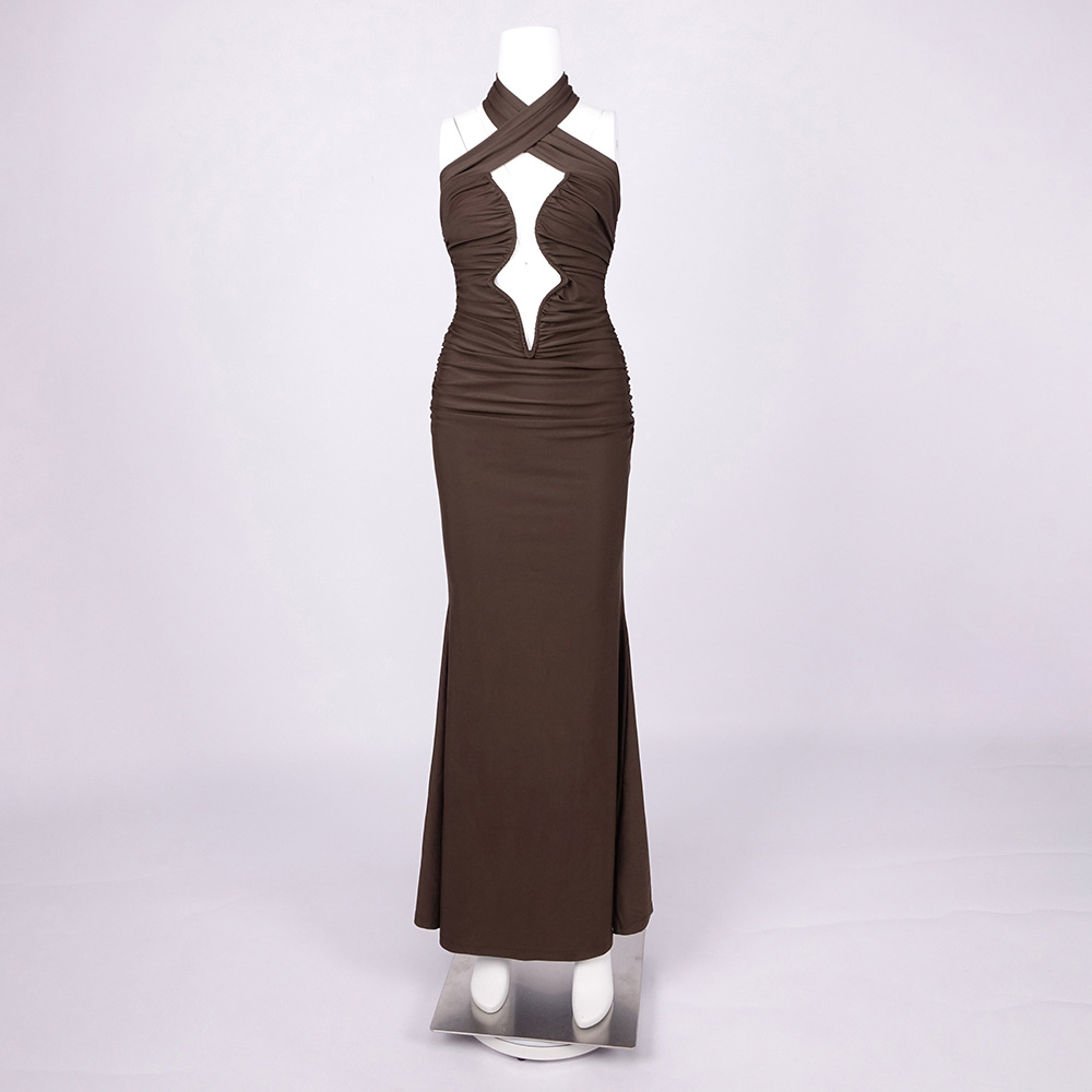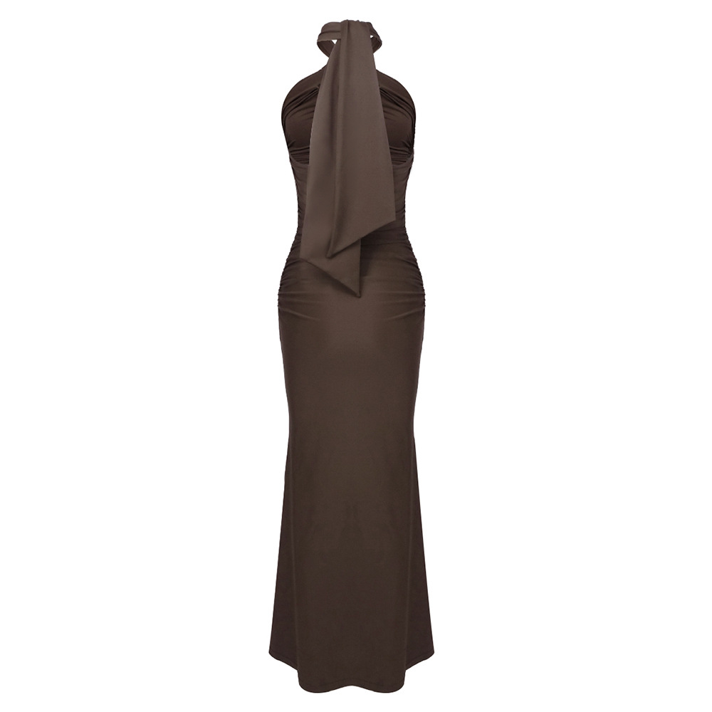 Mocha Brown Halter Cutout Ruched Maxi Dress - Cross Strap Plunge Neck Bodycon Gown BD2662