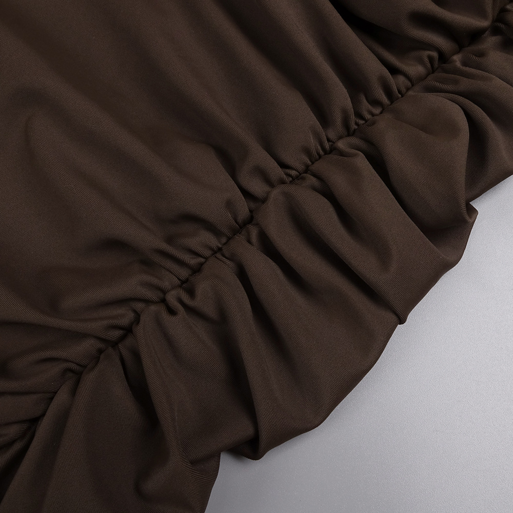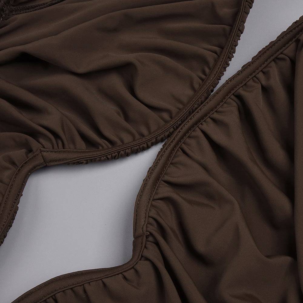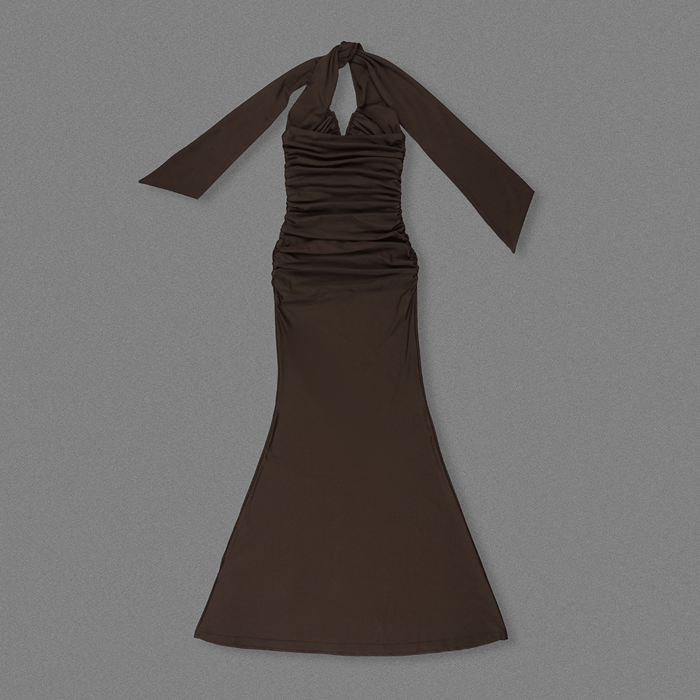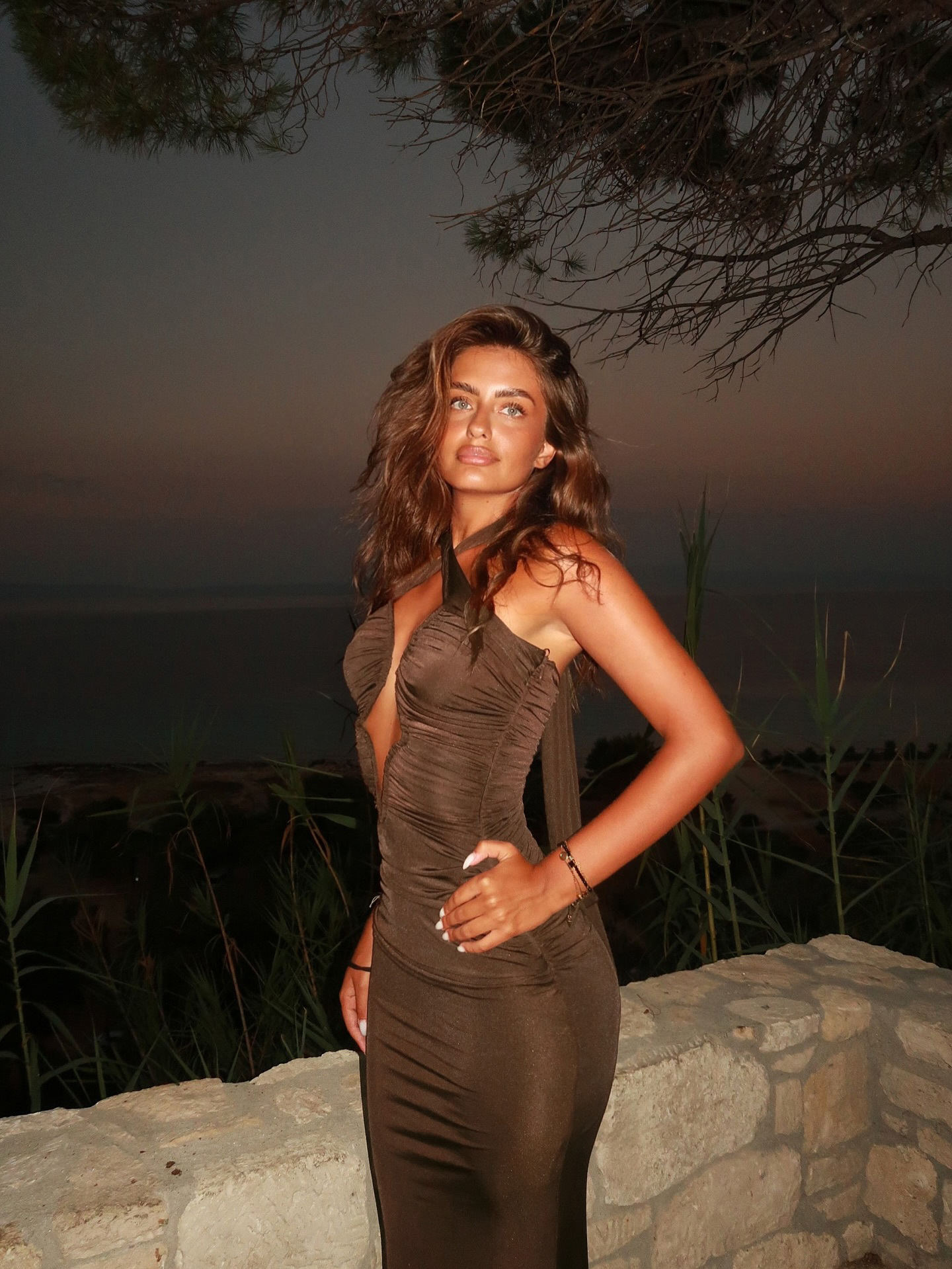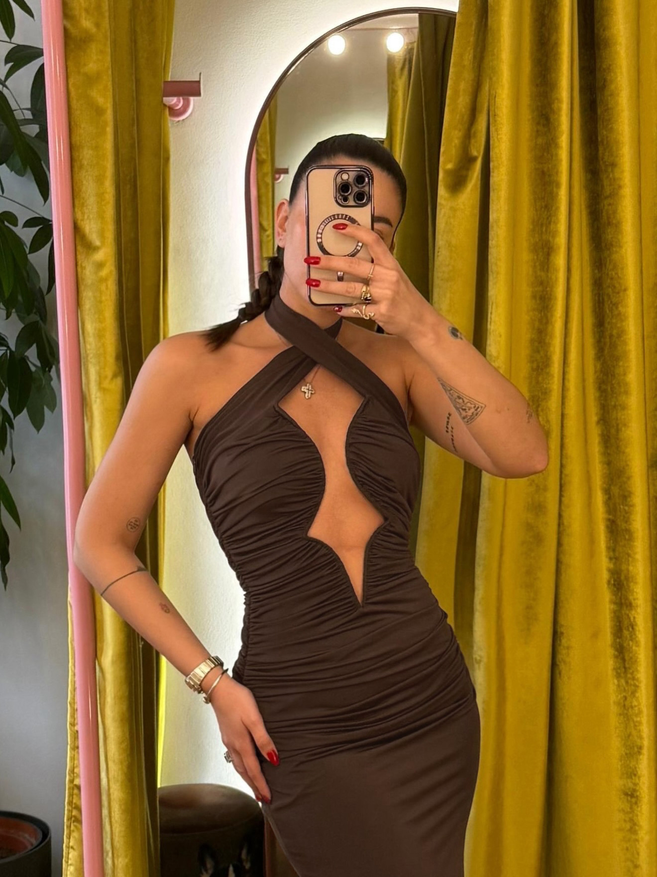 Mocha Brown Halter Cutout Ruched Maxi Dress - Cross Strap Plunge Neck Bodycon Gown BD2662