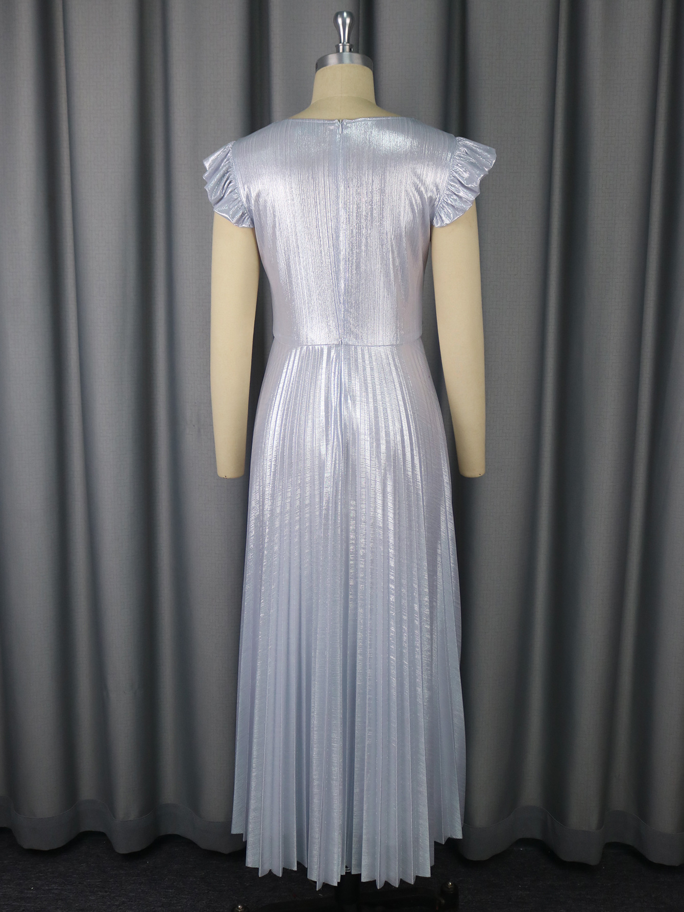 Plus-Sizes Glamorous Metallic Pleated Maxi Dress with V-Neck and Ruffle Sleeves - Elegant Silver Formal Gown AM050341