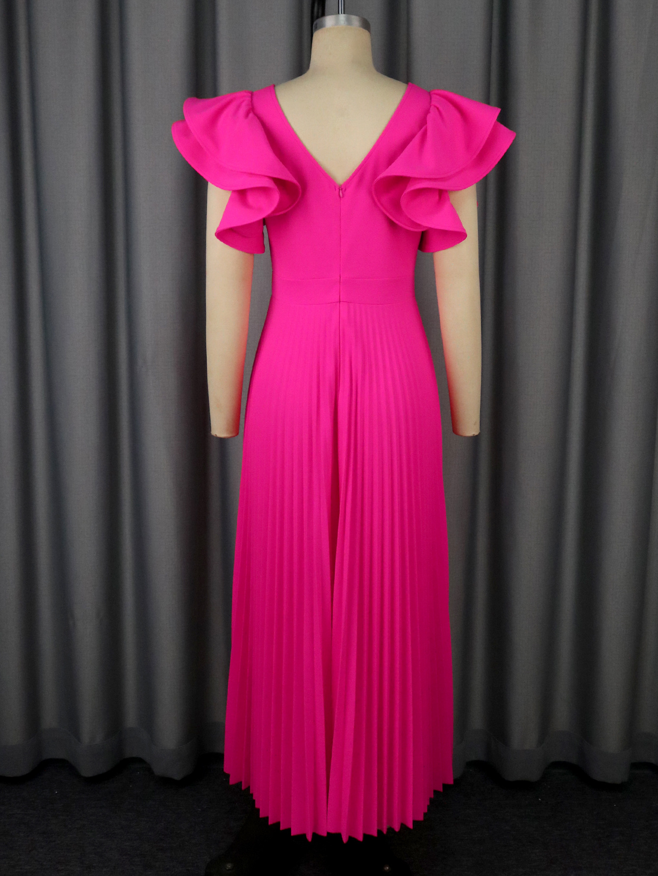 Plus-Sizes V-Neck Ruffle Sleeve Pleated A-Line Maxi Dress - Elegant Solid Pink Party Gown AM050446
