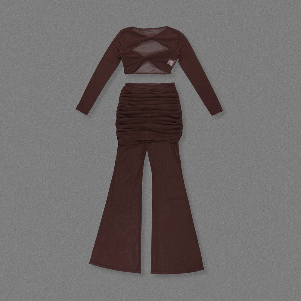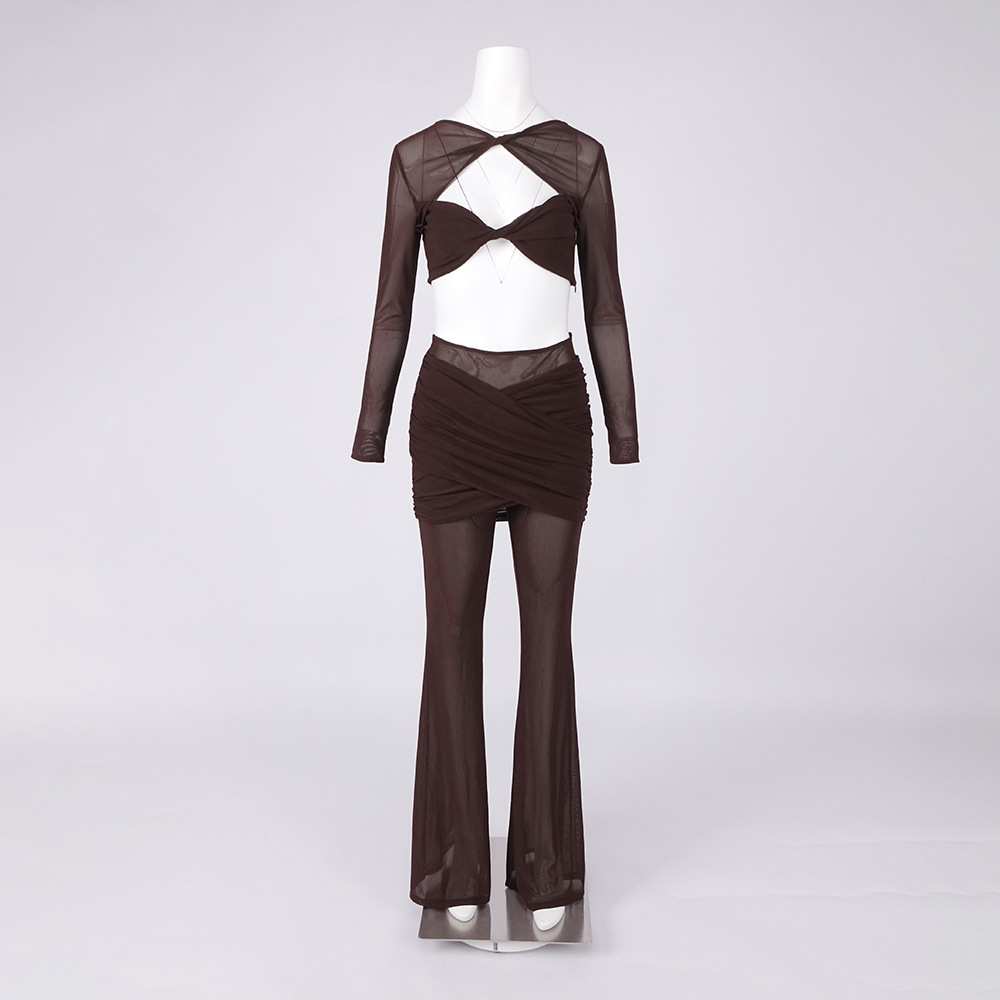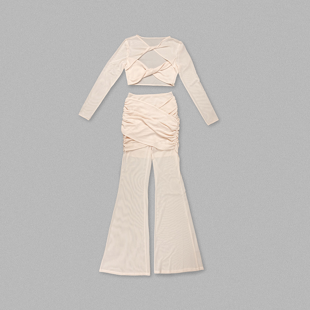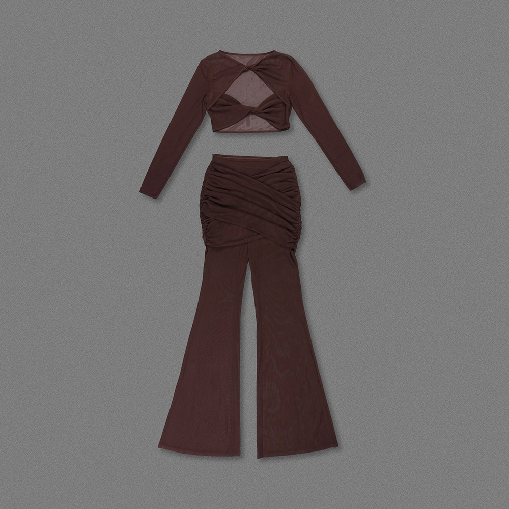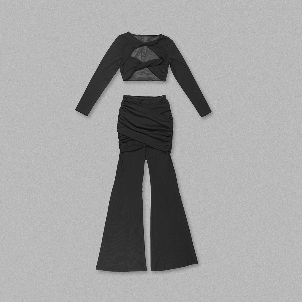 Sheer Mesh Twist Cutout 2 Piece Set - Long Sleeve Crop Top & Flared Pants Co-ord BD2513