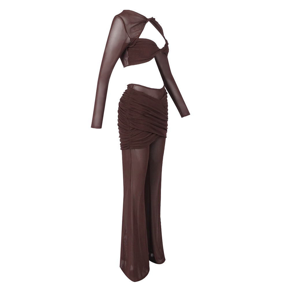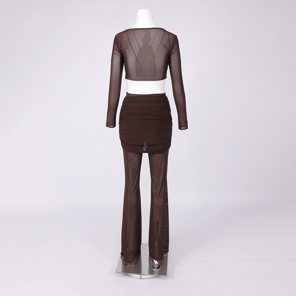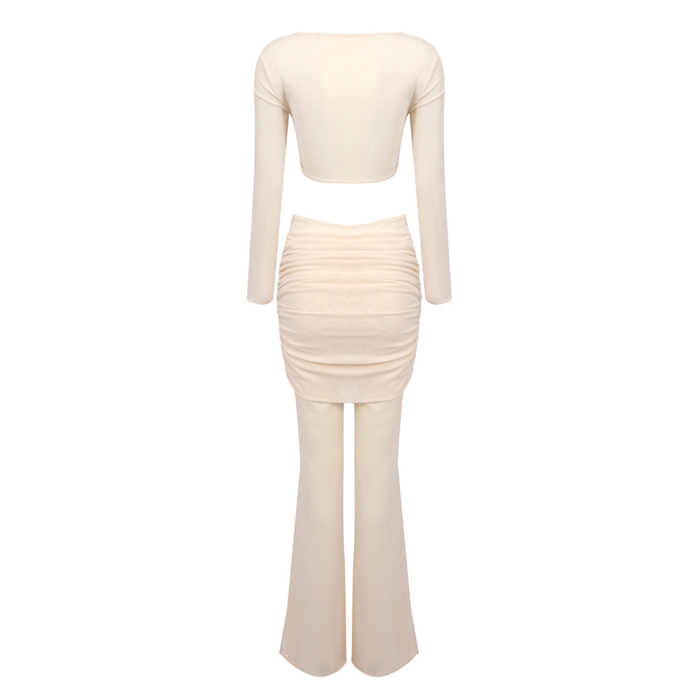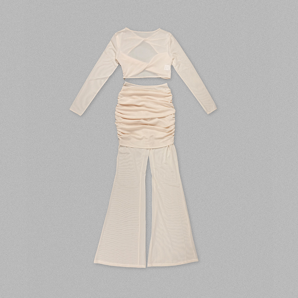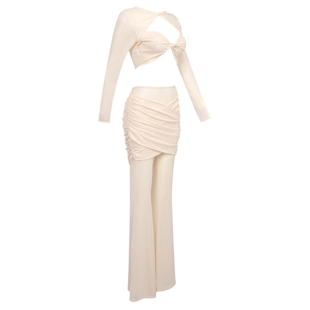 Sheer Mesh Twist Cutout 2 Piece Set - Long Sleeve Crop Top & Flared Pants Co-ord BD2513
