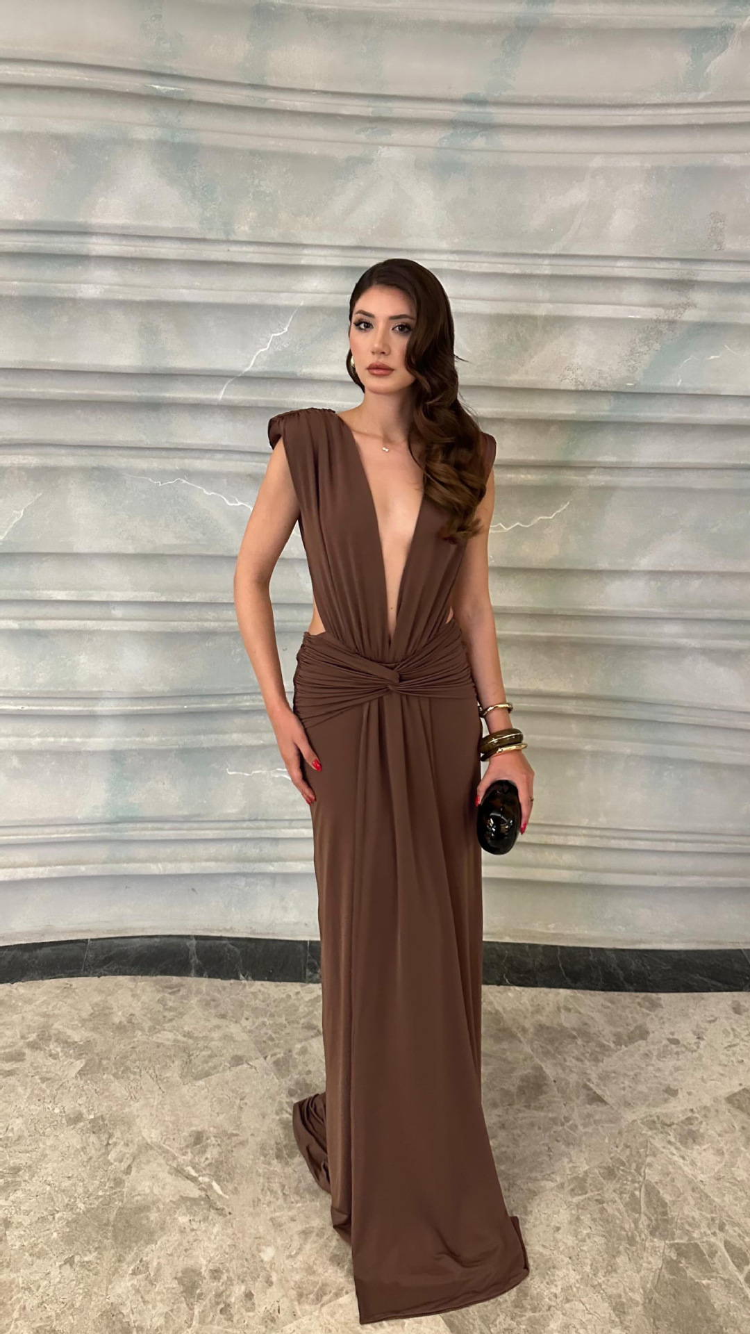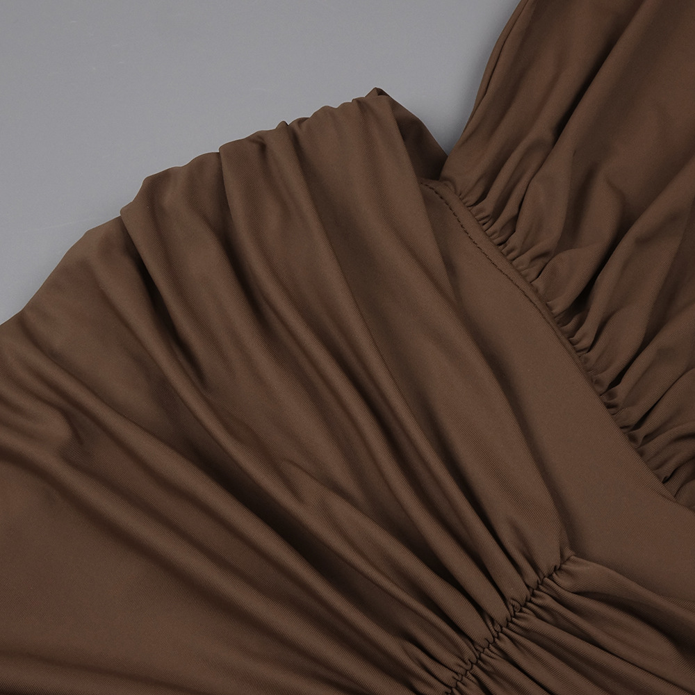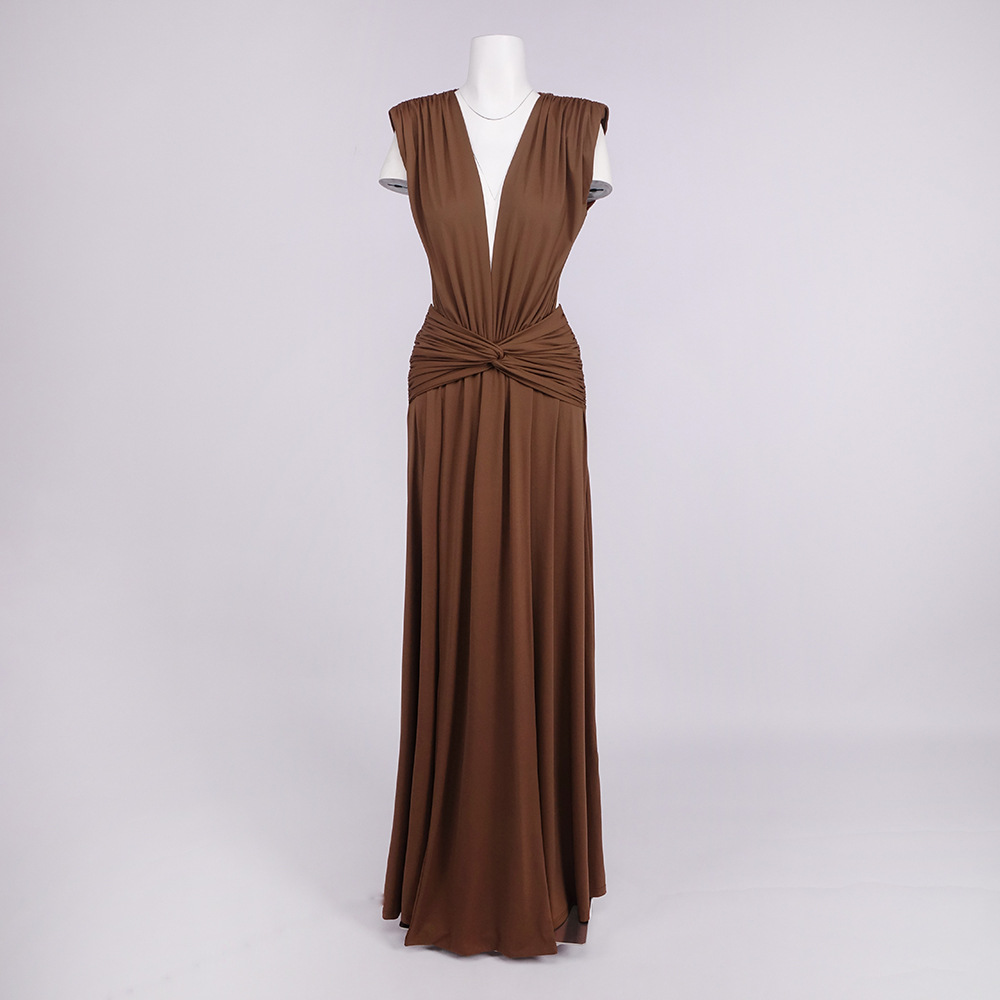 Bronze Goddess Deep V-Neck Draped Maxi Dress - Sultry Sleeveless Backless Ruched Evening Gown for Summer Soirée BD2673