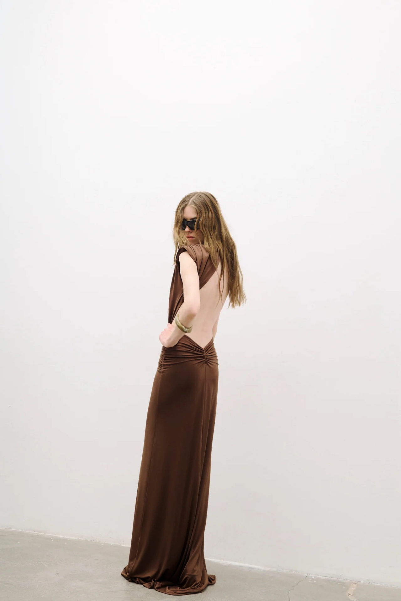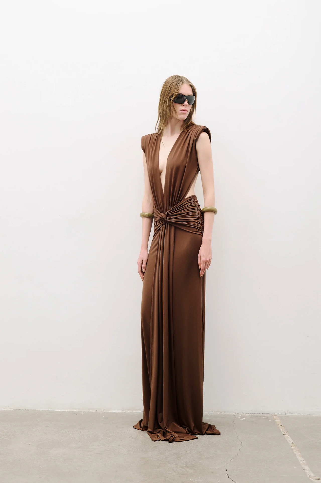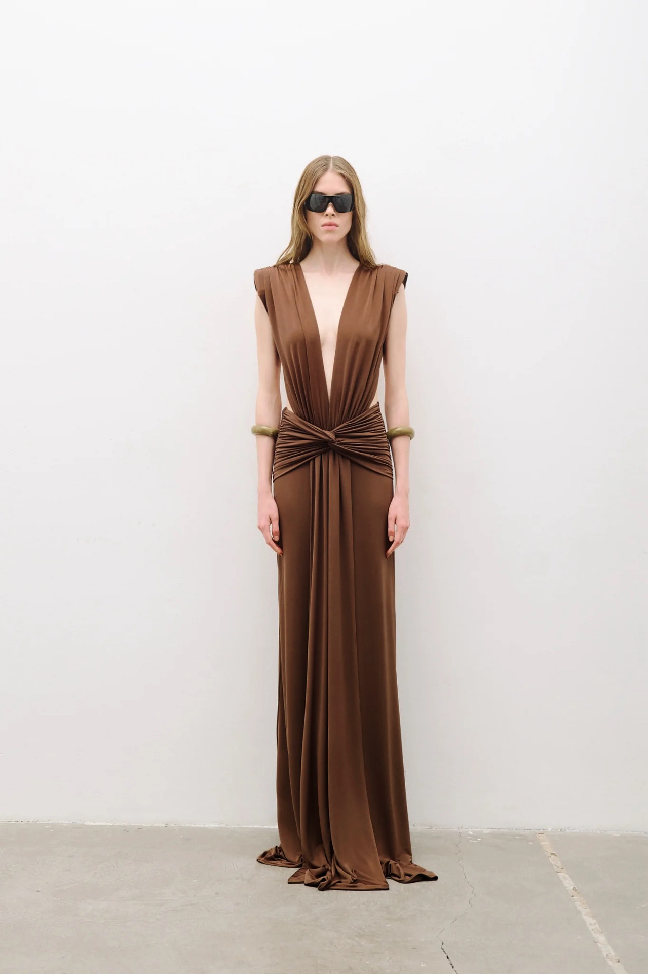 Bronze Goddess Deep V-Neck Draped Maxi Dress - Sultry Sleeveless Backless Ruched Evening Gown for Summer Soirée BD2673
