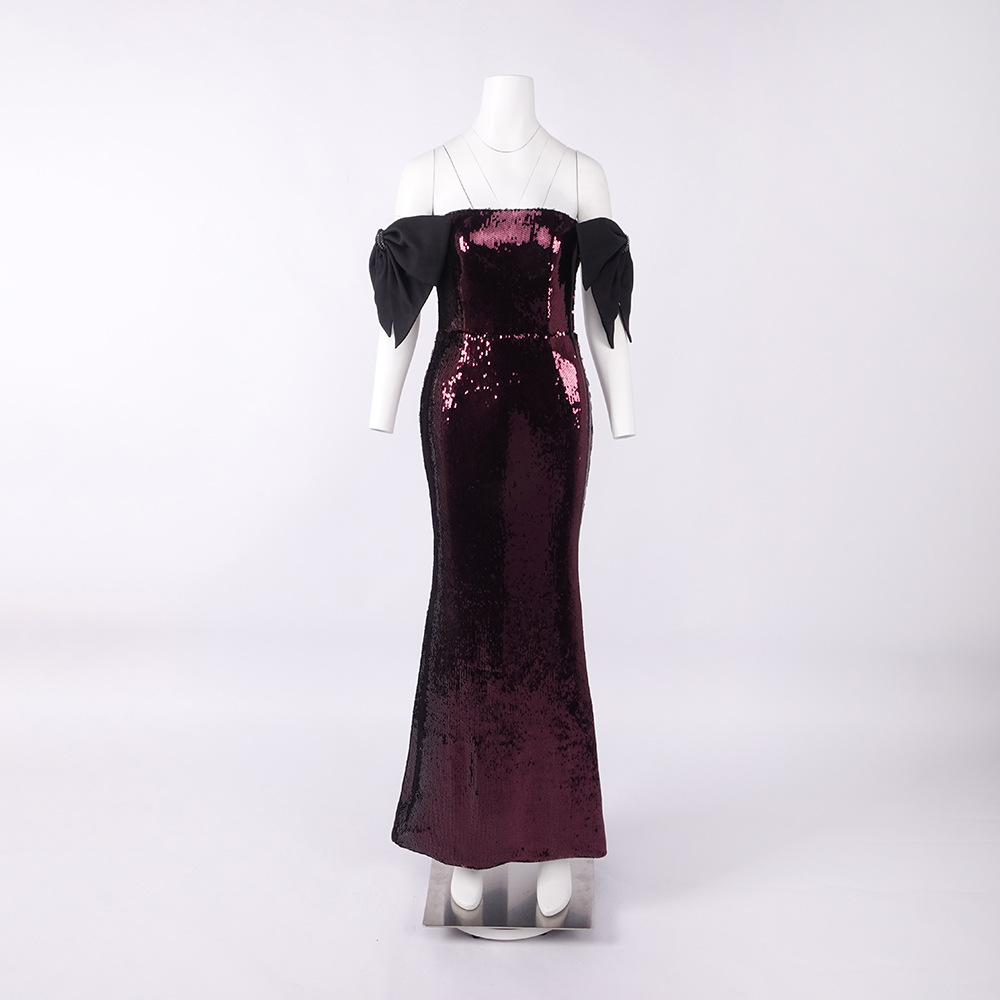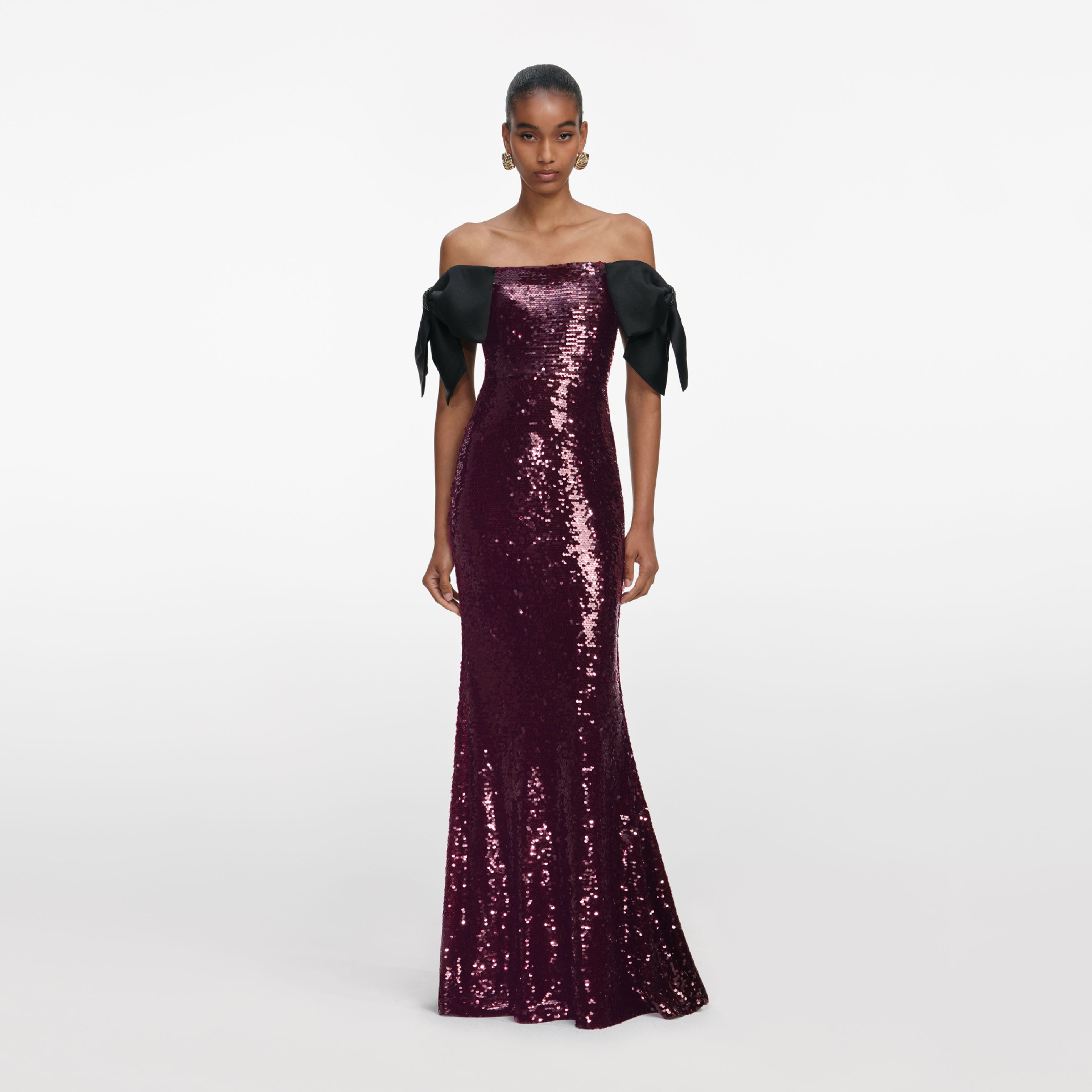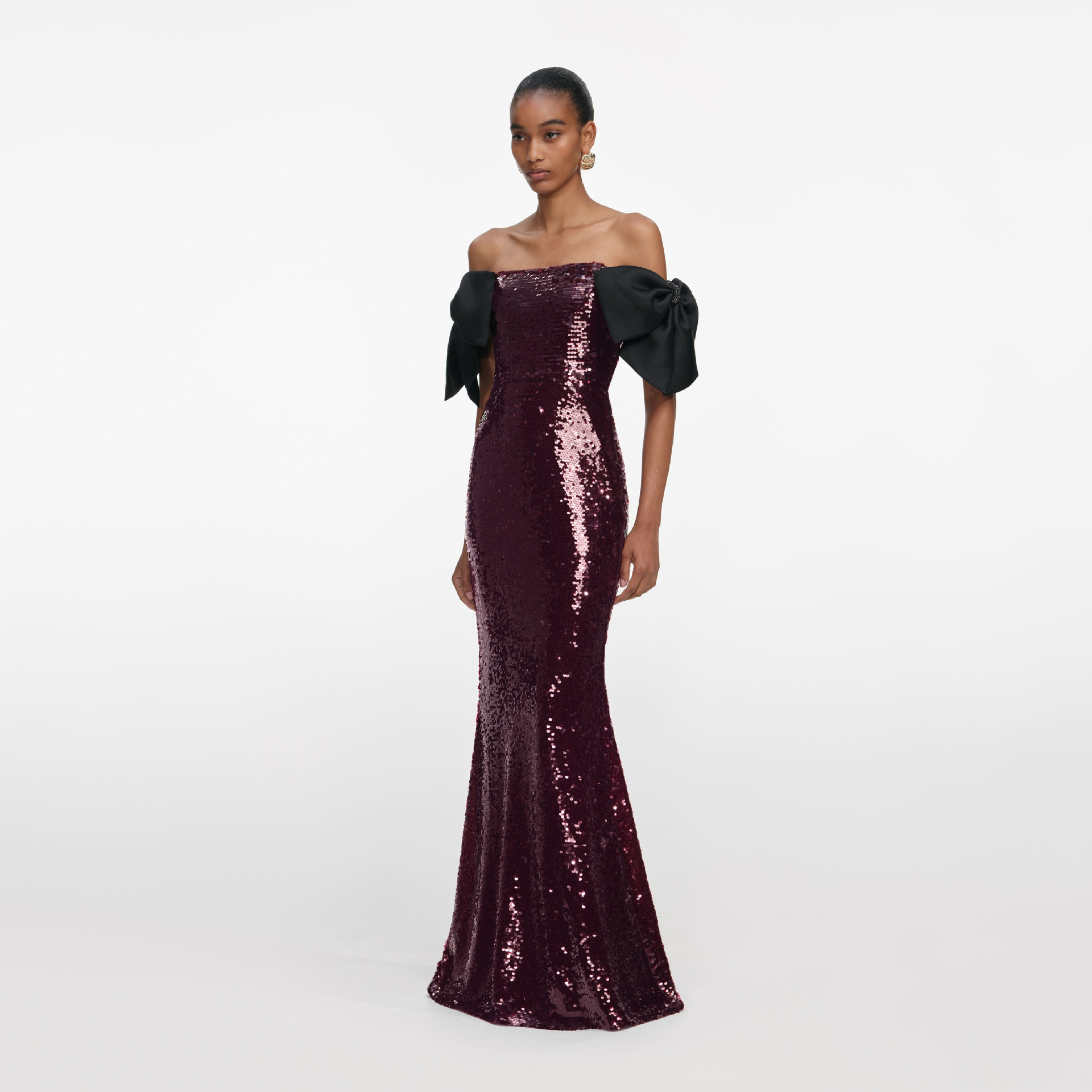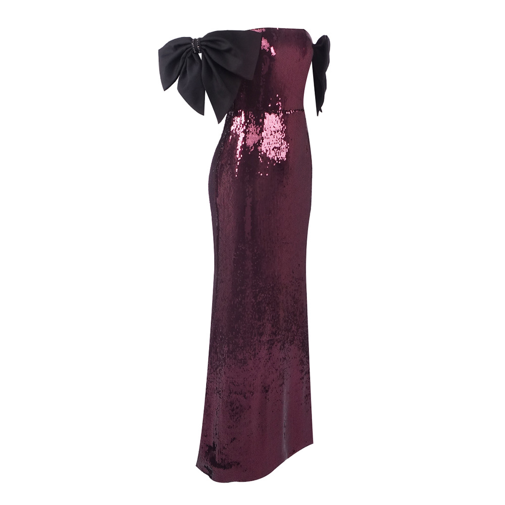 Elegant Wine Red Sequin Off-the-Shoulder Evening Gown - Formal Maxi Dress with Oversized Black Bow Sleeves for Gala & Prom Z0044