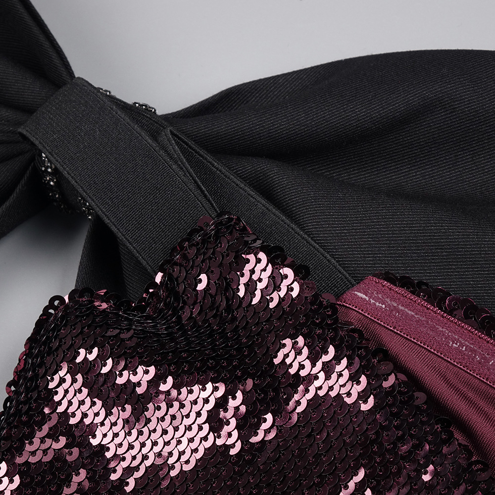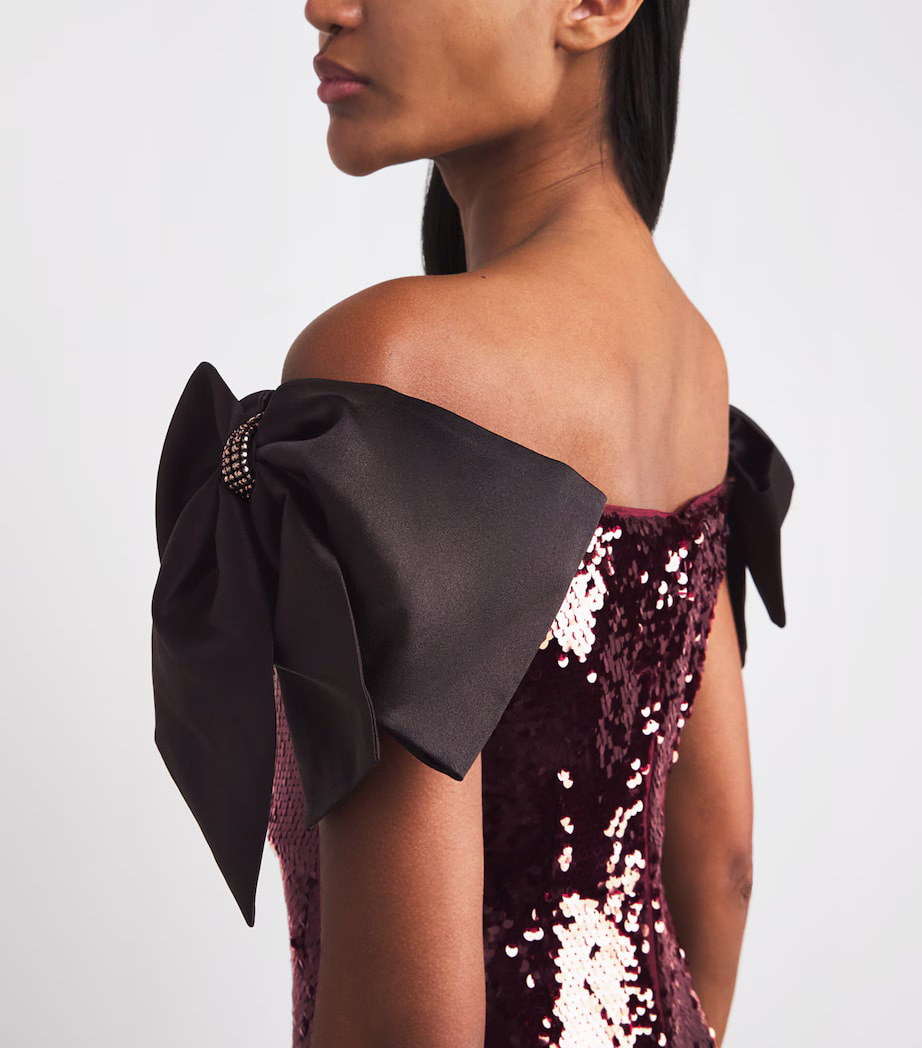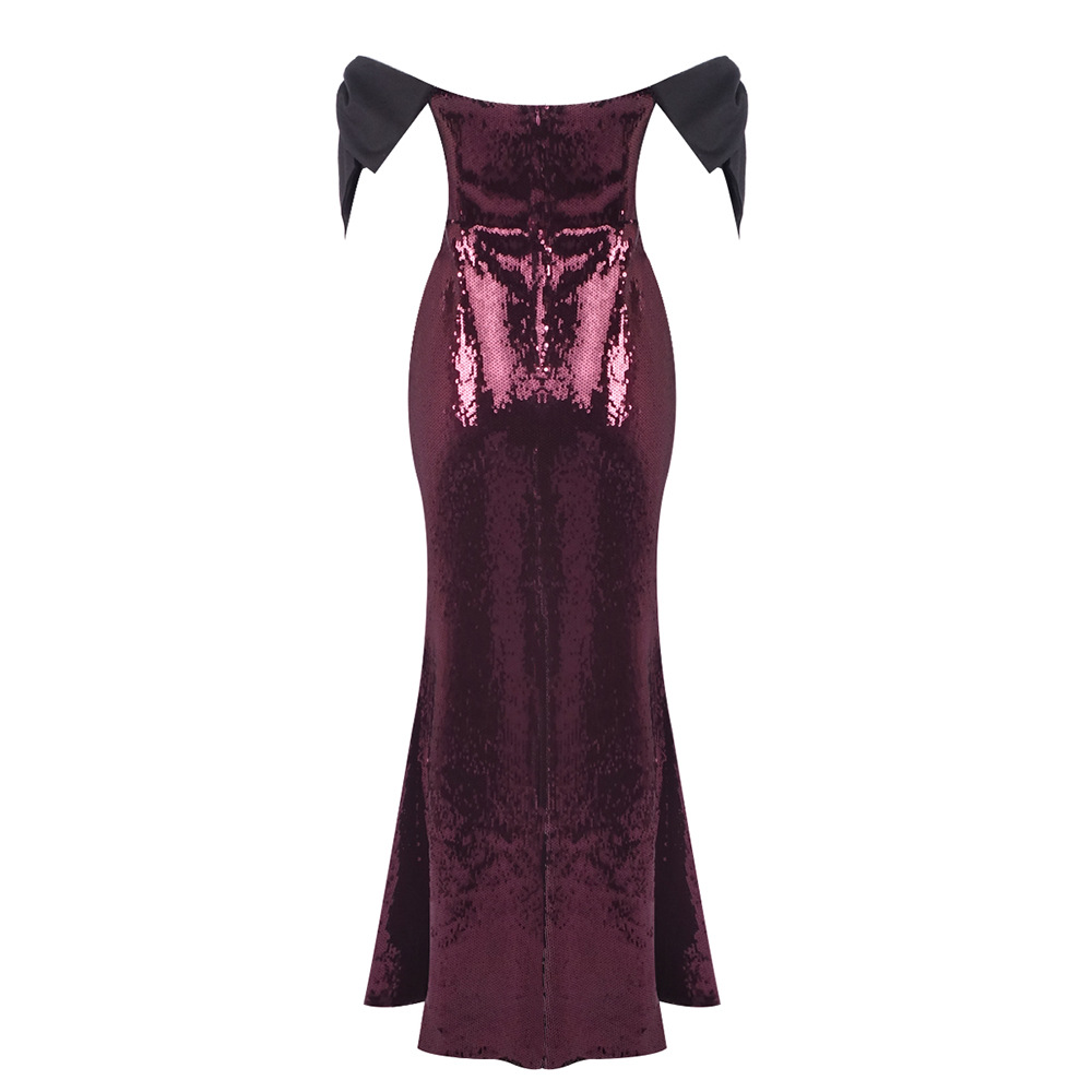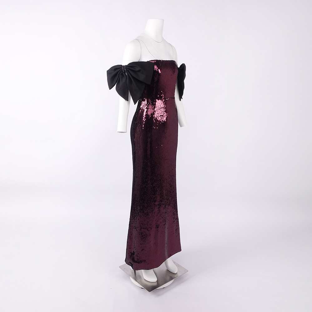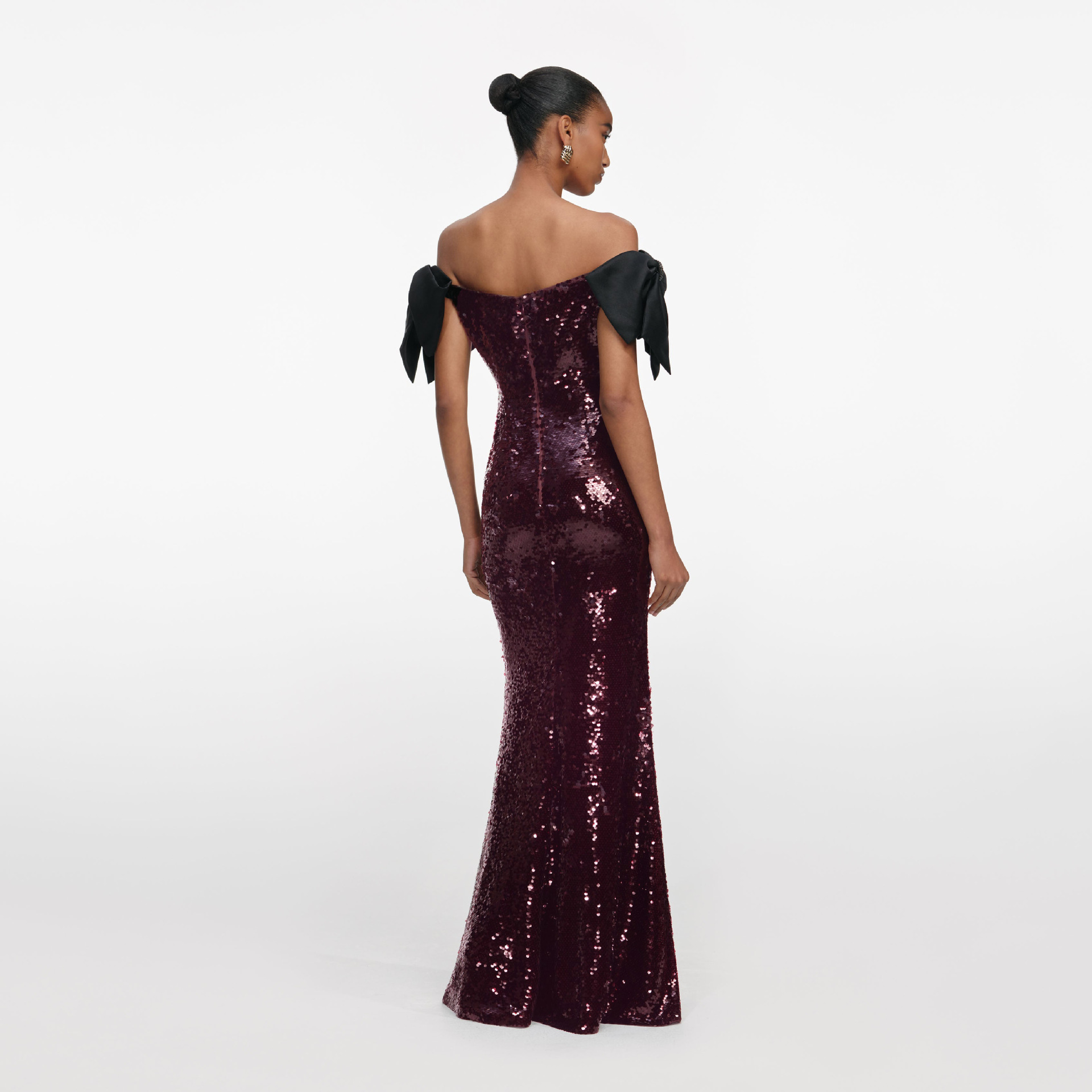 Elegant Wine Red Sequin Off-the-Shoulder Evening Gown - Formal Maxi Dress with Oversized Black Bow Sleeves for Gala & Prom Z0044